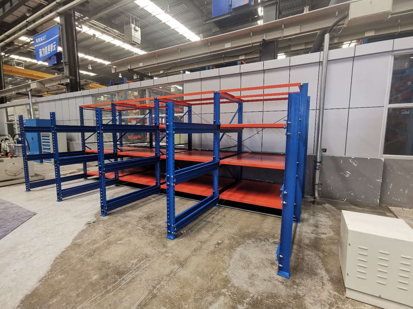 上圖是我司給沈陽一家公司生產定制模具貨架,模具架規格:L5700*D2600*H2090 數量一排、層數為3層加固定板 每層載重1000KG,可抽屜1300MM,立柱10#槽鋼,滑槽4.0+3.0厚度,面板1.5mm 抽屜板可按50倍數調節層高 顏色:立柱藍色/抽板桔紅色 噴涂 酸洗 磷化 防靜電噴涂