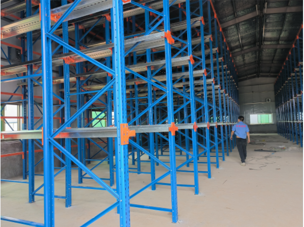 首先依據(jù)客戶倉(cāng)庫(kù)的高度規(guī)劃貫通式貨架,貨架高度達(dá)到了庫(kù)房的全高,這樣可以做成了4層貨架,把貨物放置在托盤(pán)上,可直接運(yùn)用叉車進(jìn)出貨品。在貫通式貨架上會(huì)安裝上導(dǎo)軌,可降低了貨物和貨架的損壞率。